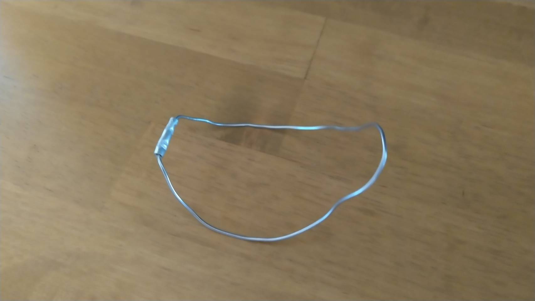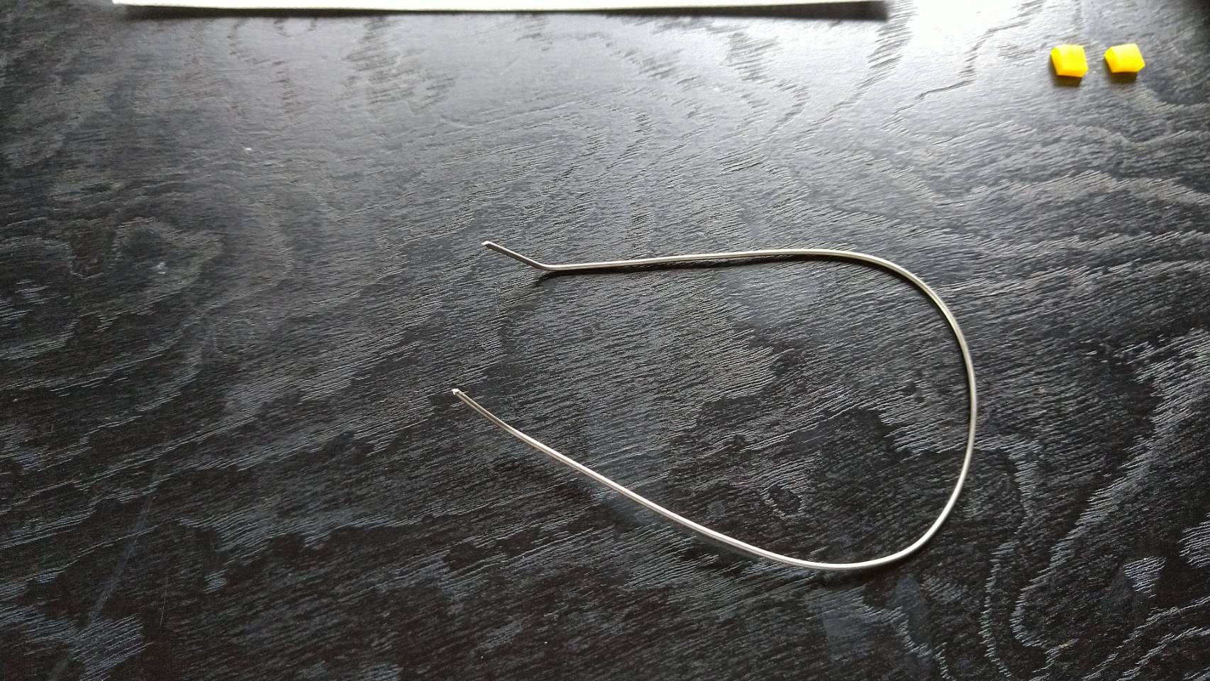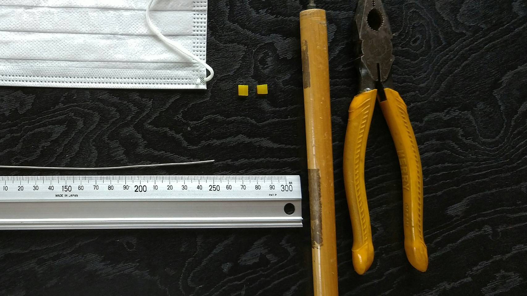 ①直径1㎜のステンレス針金、針金切断用のペンチ、先が一番細いキリ、幅5㎜角厚さ3㎜程度の大きさのゴムを二箇(輪ゴムの材質に似ている物)を用意します。