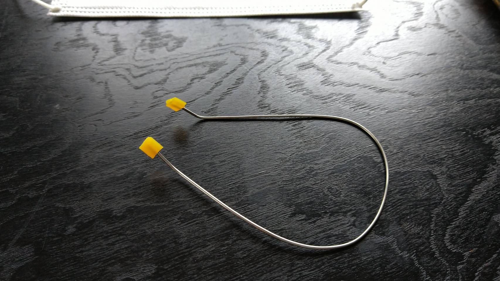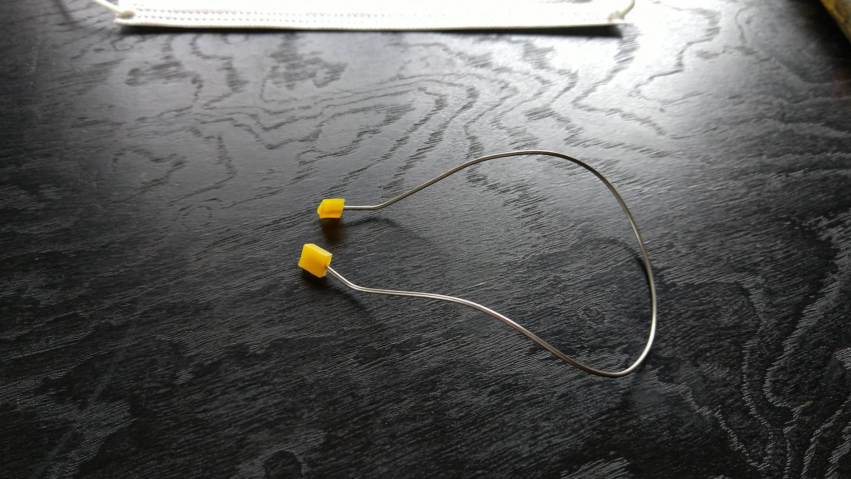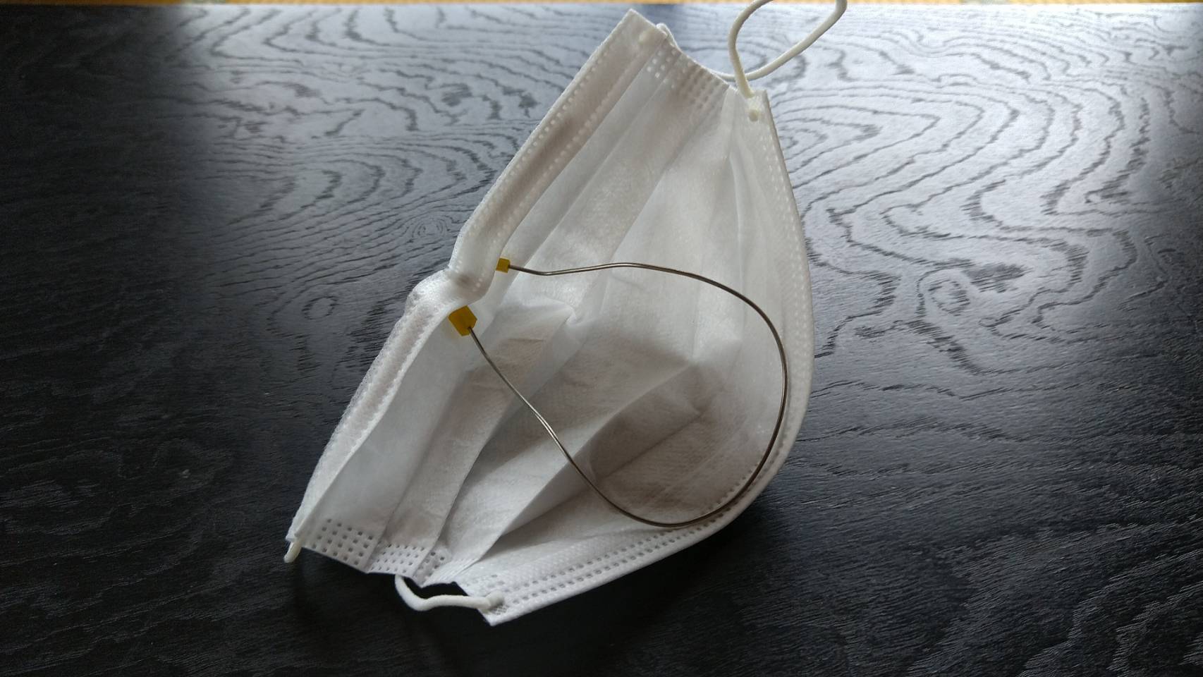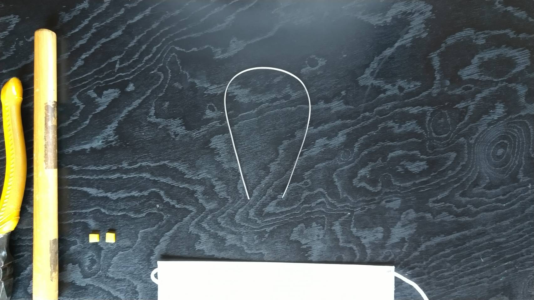 ⑥左右均等に全体を湾曲させます。どのくらいの湾曲かは、個人個人の鼻の高さ、鼻柱の太さ、頬骨の高さ等々で個人差がありますので、自分に合うように調整して下さい。マスクのカーブが相手に向かって凸とすれば、針金の設置形状はマスクの中で凹となり、頬骨を支えとして口の前に空間を確保する様になります。