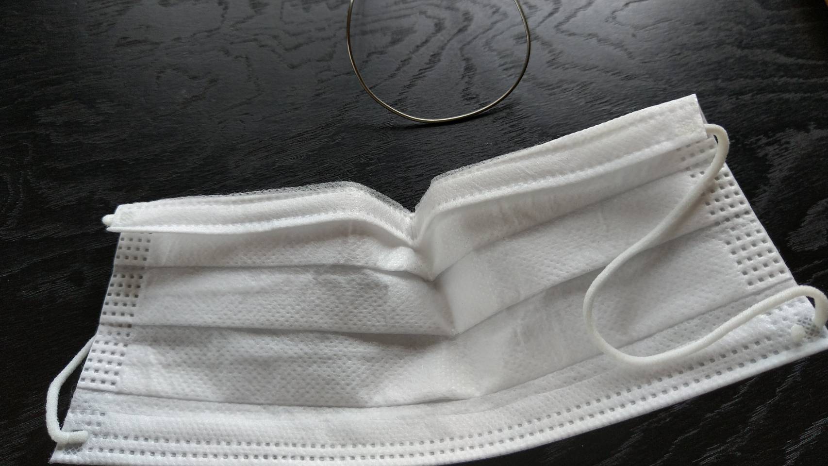 ⑦鼻固定のワイヤーが上部に付いているマスクがベストマッチです。上部のワイヤーの幅を内側へしっかり一折し、中央の鼻柱の部分もしっかり山形に曲げ、折が甘い為に戻ったり膨らんだりしないようにします。内側に一折する事によって、メガネをしている人は、メガネの曇りを半減する効果があります。