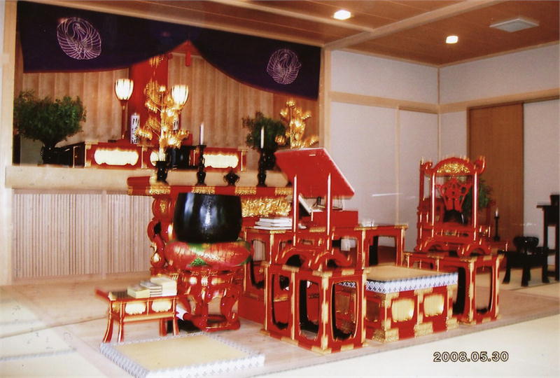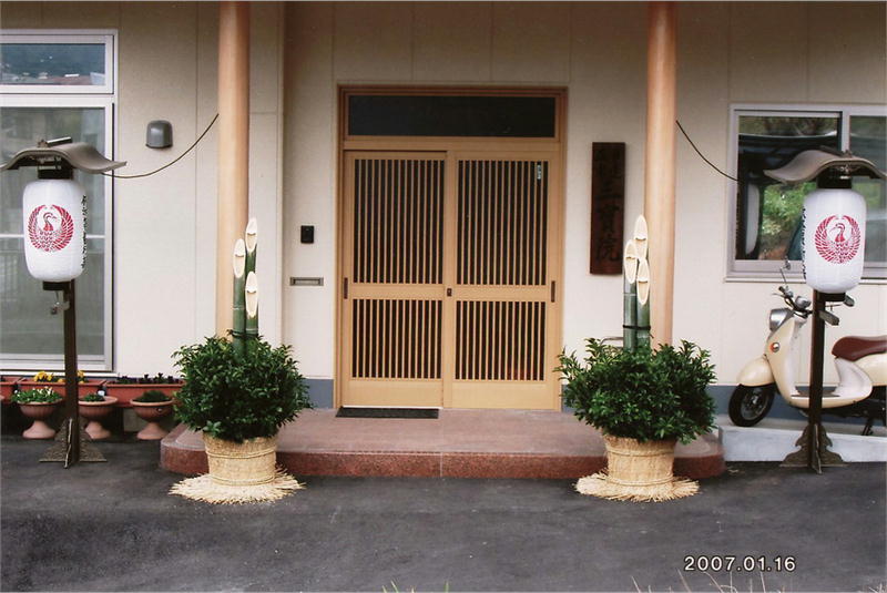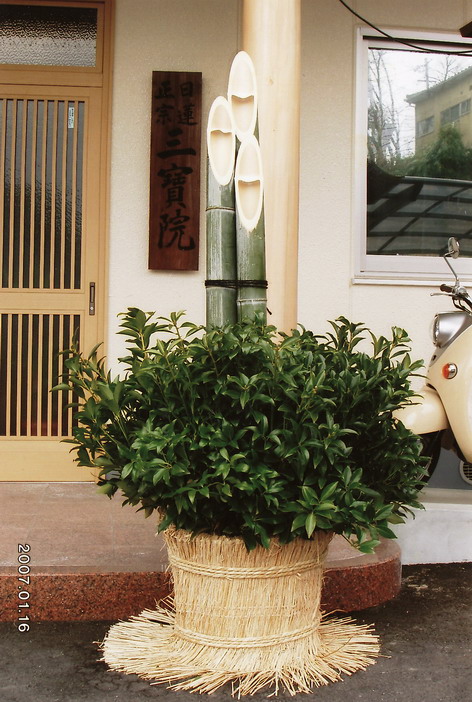 三寶院も以前は世間一般の松竹梅、南天、葉ボタンで飾った門松を造っていましたが、平成17年から、日蓮正宗独自の伝統的門樒(かどしきみ)を造る様にしました。門松は、新年に歳神を迎える依代(よりしろ)目印と解釈されていますが、日蓮正宗では歳神も含め、諸天善神は常に存在するもので、正月だけに降りて来るものではなく、法華経の行者守護の任が本来の努めであります。故に、日蓮正宗の門樒は、世間の慣習と、本尊に御供えする樒を世間に向けて飾り、一般の人々にも、ここに本門の本尊が御座しますことを、妙法の縁として正月に示す意味を持って飾ったと思われます。いつ頃からどういう意味でといった資料が一切ない状態ですが、毎年、大石寺の三門に門樒が飾られます。